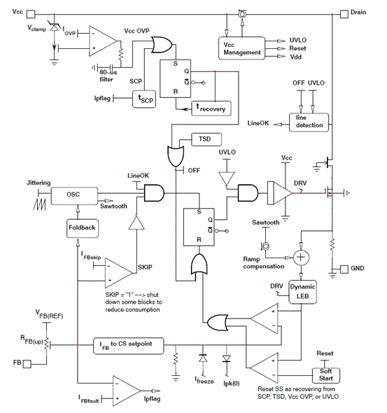 ON Semi 公司的 NCP1072/NCP1075 集成了 700V MOSFET 的固定频率电流模式控制器,包括软起动、频率抖动、短路保护、峰值电流设定点、斜率补偿、跳频模式、动态自供电源、无负载输入功耗小于 50 mW,主要用于辅助电源、待机电源、白色家电、智能电表。