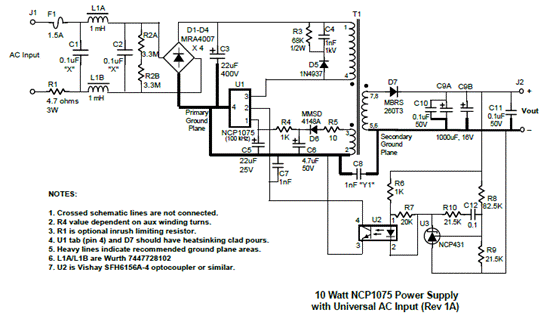 图2.NCP1075 12V/0.85A通用输入电源电路图